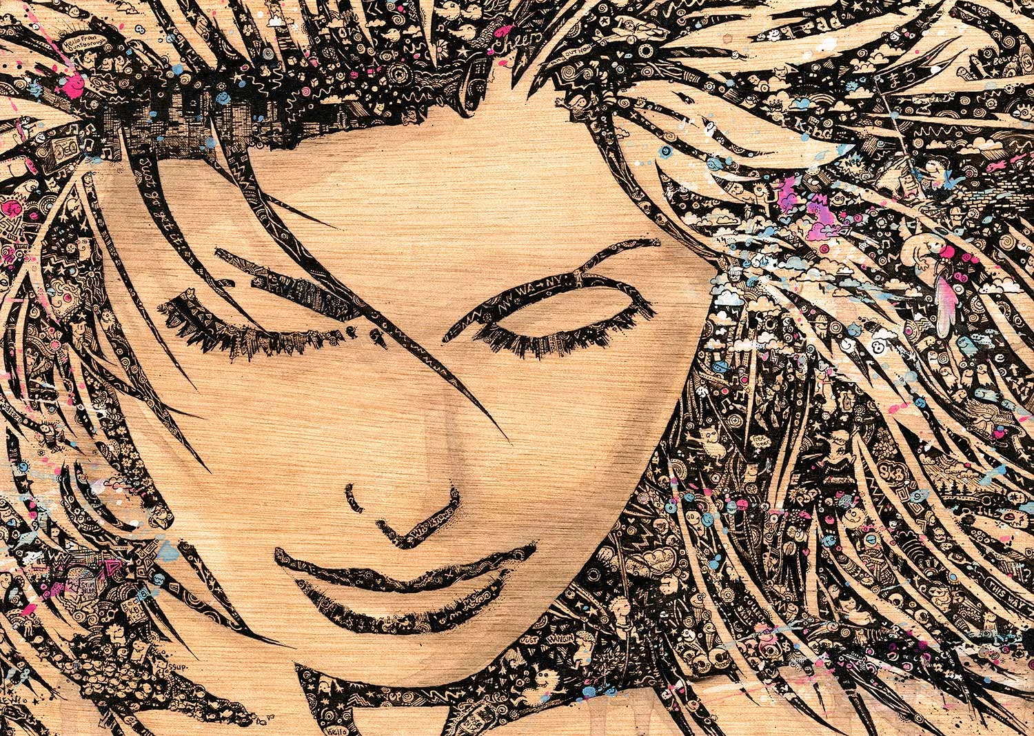 Acrylic, aerosol and ink on timber board